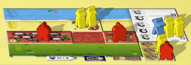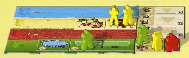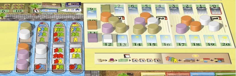 Player Orange has 8 chalets and 8 tourists. So the chalets are complete full. The more attractions you have, the longer the tourists stay. Comfort tourists (red, not present here) would only stay 1 week, because there are no boulevard (red) attractions (bar/terrace/restaurant). Beach tourists (yellow) stay 2 weeks, because of the beach chairs. "Swimmers" (sea fans) stay 3 weeks, because they can dive and ride jetski. |