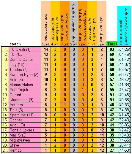 - Underlined: matches without golden goal in extra time: score is underlined at the coach who