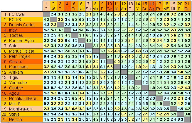 This is a one-match-against-each-other-competition, so all endscores are placed twice